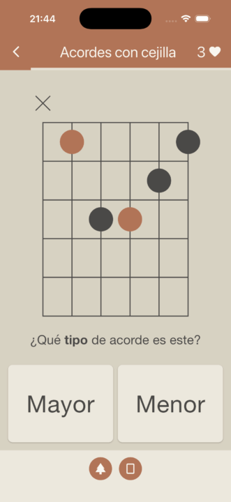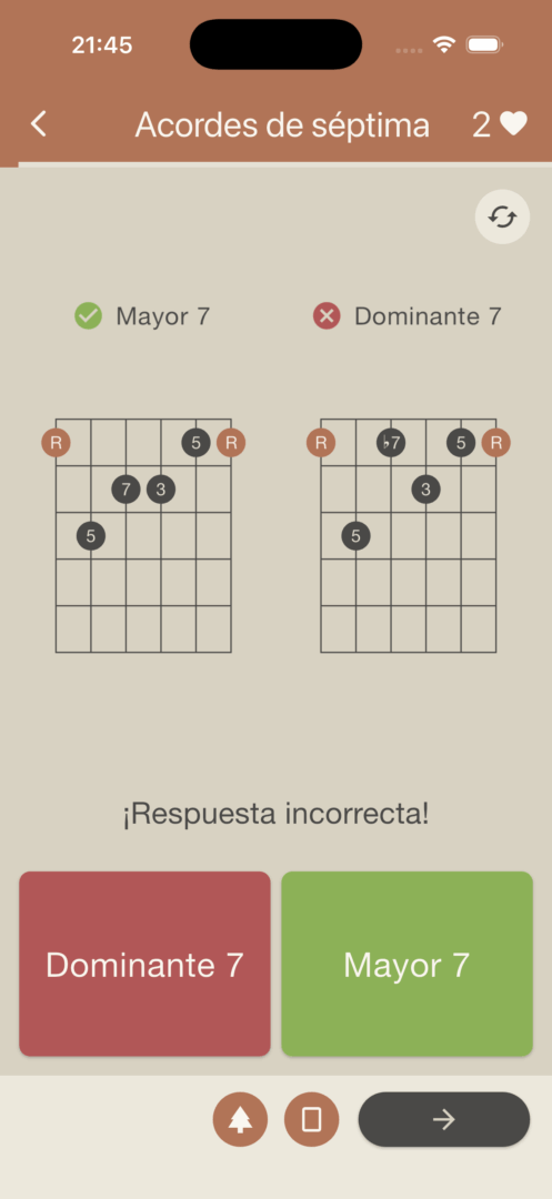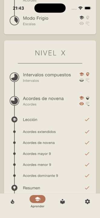 Lecciones con acompañamiento de sonido y desafíos de audio específicos para reconocer intervalos, acordes, escalas y progresiones de oído.