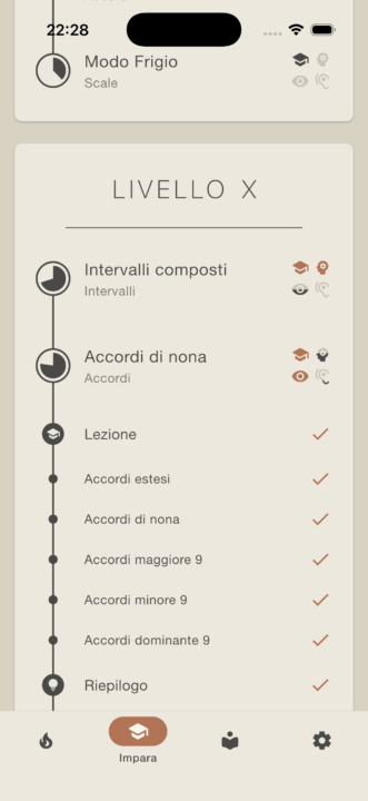 Lezioni supportate da audio e sfide audio dedicate per riconoscere intervalli, accordi, scale e progressioni a orecchio.