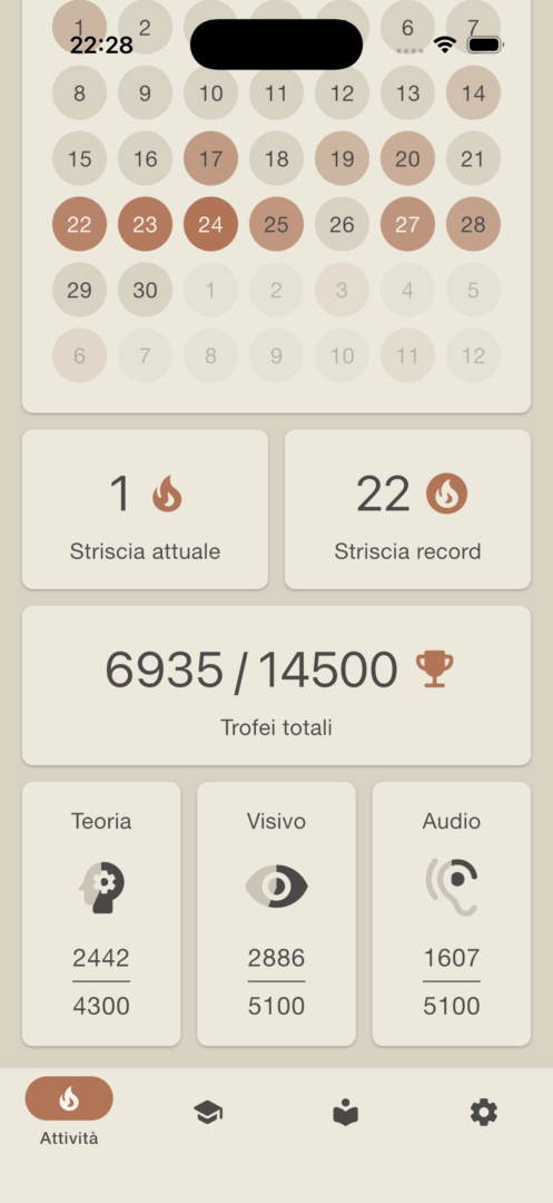 Rapporto giornaliero delle attività, serie di risultati e stato di completamento globale, per aiutarti a rimanere motivato e concentrato sui tuoi obiettivi.