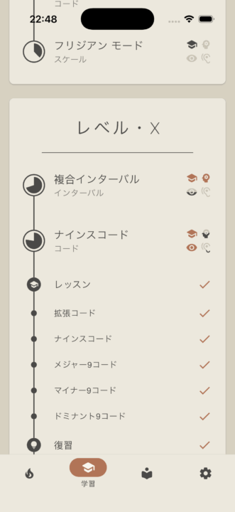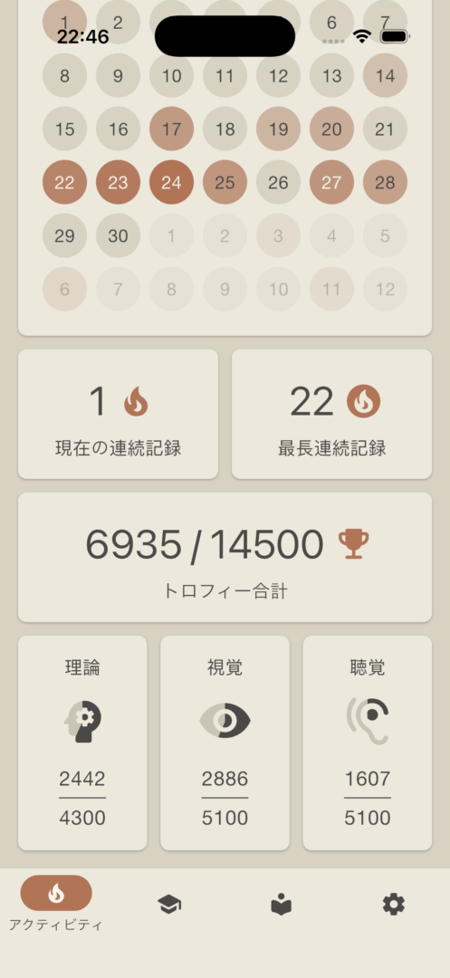 難易度が段階的に上がる理論・視覚・聴覚ベースの課題とトロフィー制度で、ドーパミン中毒の脳も働かせます。